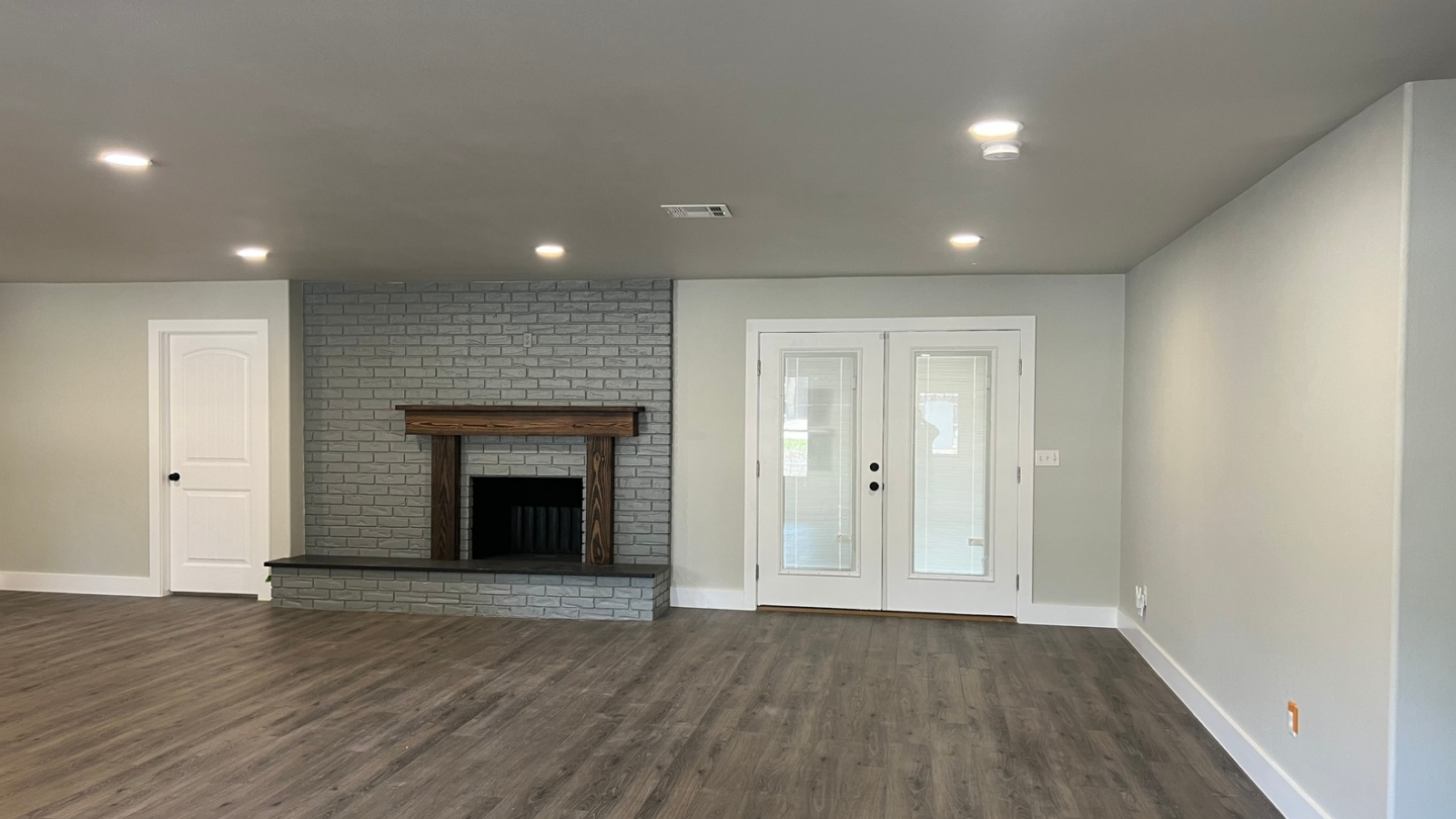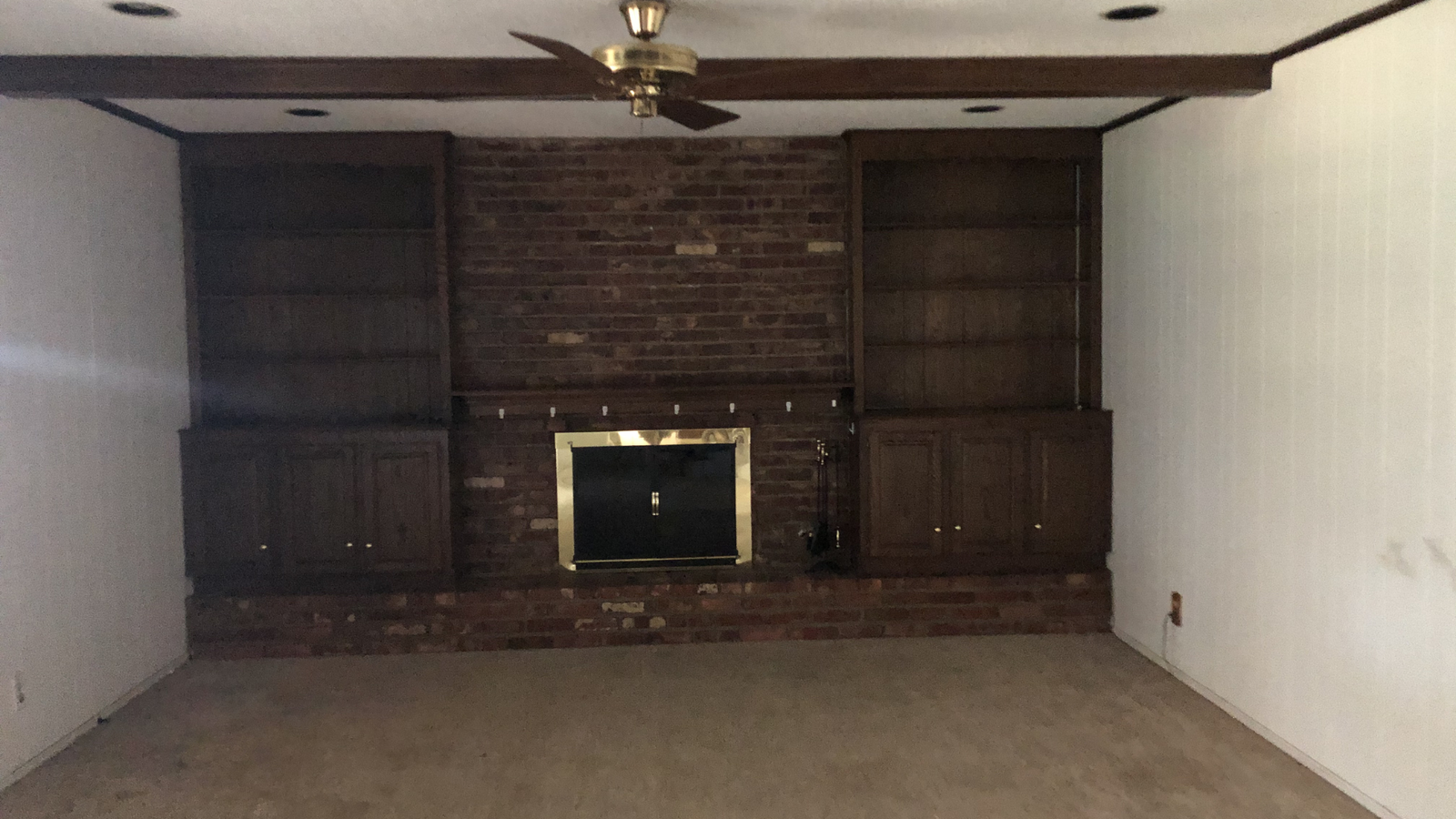 - Custom built-in shelving and fireplace surround with updated brick finish